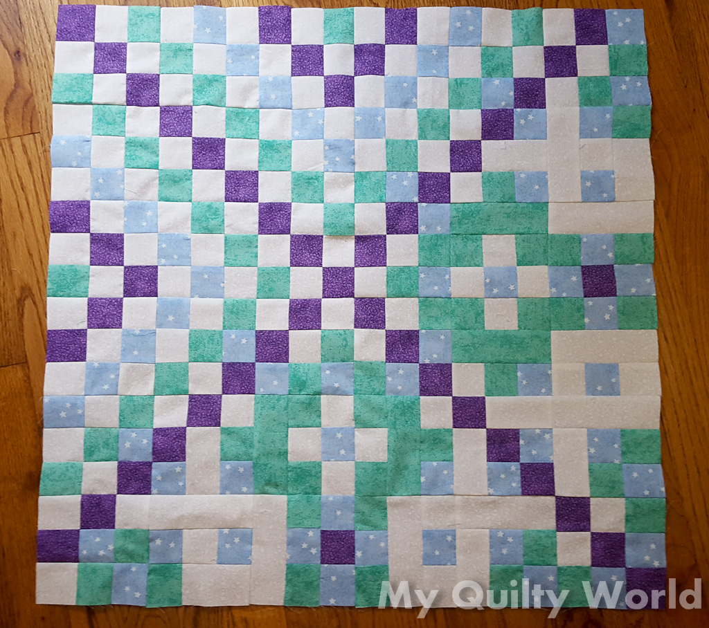 Oh my it's getting close now. Take your Big Block, Corner Blocks and Center Medallion to your layout area. You are now creating a GIANT nine patch. And you should be dang good at them by now. The corners contain the checkerboard area and the Big Blocks are set so that the individual 2" x 5" white and green bricks are on the outer edge, thus creating ribbons all around the center.
