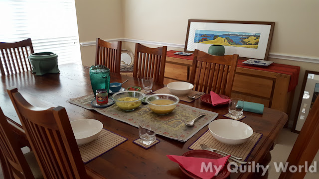 I have finished pulling fabrics for Desert Sky AND also for the second day's class of some placemats we are working on. The batiks have been put away and I am drawing owl parts for our November project.As I work away making 18 sets of parts and pieces, Allison and I just chat away while listening to Valerie downstairs. Soon, we are called and make our move to downstairs.
