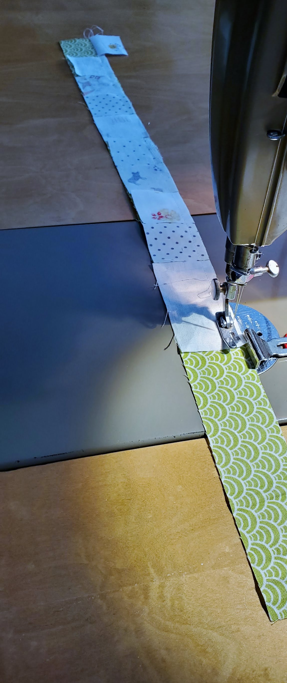 Now, back to the fun. Strip sets get going. Due to using a constant green, I am able to just add neutral strips as I go. Since the parts for the geese are also cut, I work in sections. First the strip sets, then the first wing, then the third strip to the sets. It allows for almost continuous chaining. Some time at the iron show the fun going on.