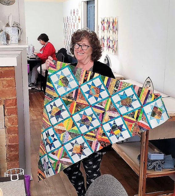 Walk over and back into the house. Ramona has complete another Quilt of Valor project - this one is Fourth of July by Bonnie. TA-DA