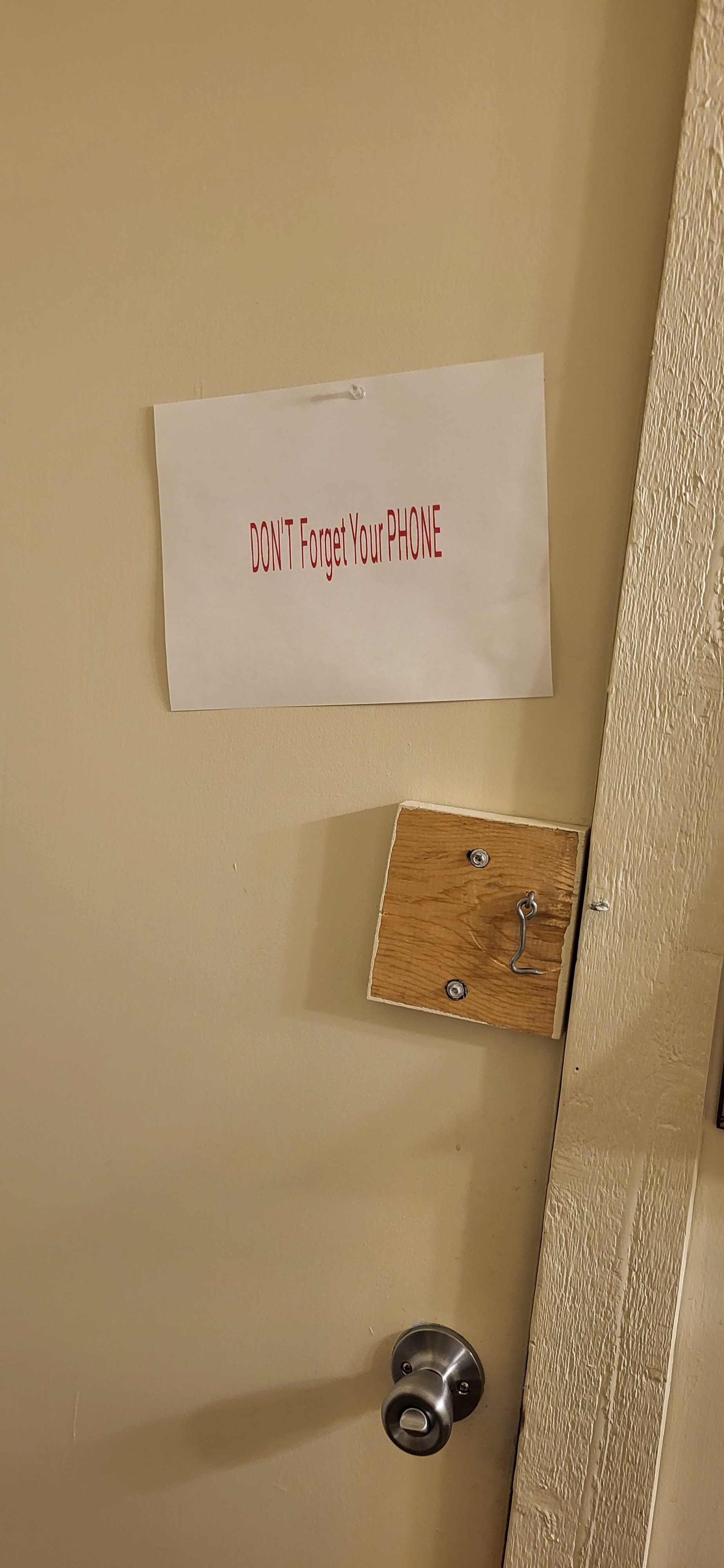 I go to use the restroom and find this soooo funny. I take the picture, use the facilities, and then leave. Minutes later I cannot find my phone and return to the restroom, where it isn't. Sherri has found it and told me to go back in and look at the back of the door. Little Stinker.